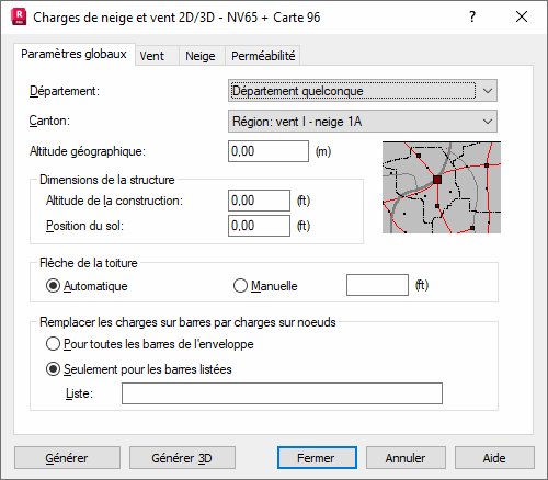 Après l’ouverture de la boîte de dialogue Charge de neige et vent et après un clic sur l’onglet Paramètres généraux, le logiciel affiche la boîte de dialogue suivante :
