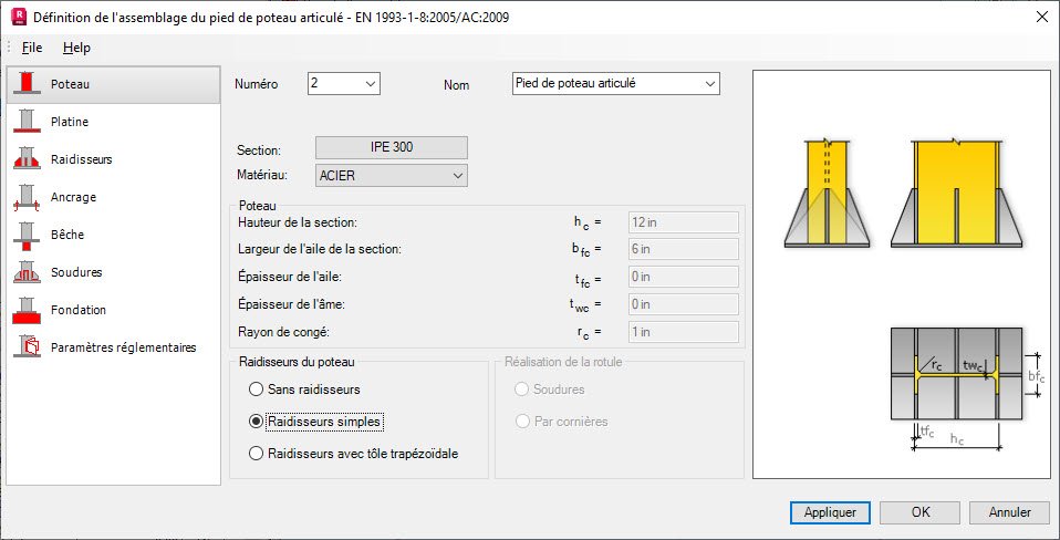 Les options disponibles sur l'onglet Poteau permettent de déterminer les principaux paramètres de l'assemblage poteau-fondation :