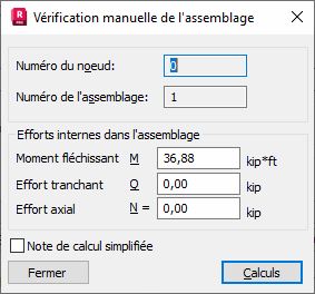 Cliquez sur ce bouton Calculs pour lancer les calculs du type d'assemblage sélectionné pour le nœud de structure étudié. Définissez les efforts internes dans l’assemblage (M, Q, N).