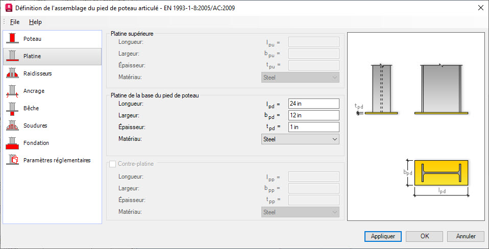 Sur l'onglet Platine, il est possible de définir les paramètres géométriques de base de l'assemblage :