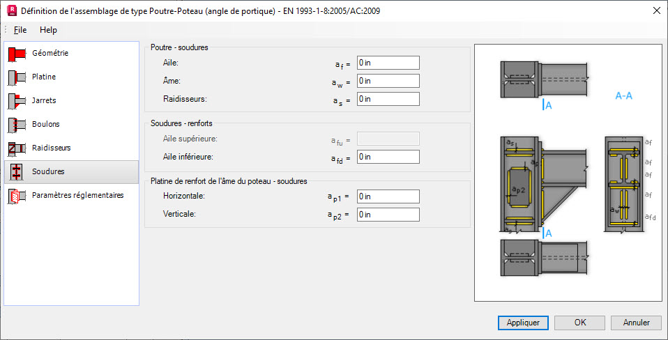 L'onglet Soudures contient les options permettant de définir l'épaisseur des soudures assemblant la poutre à la platine d'about et de celles assemblant les raidisseurs à la platine de renfort de l'âme du poteau.