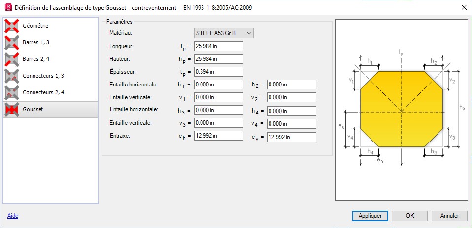 Les options disponibles sur cet onglet permettent de déterminer les paramètres géométriques du gousset ; sur cet onglet, vous pouvez aussi sélectionner le matériau du gousset.