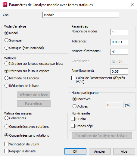 Sélectionnez l’analyse modale avec prise en compte des contraintes statiques et le cas d’analyse statique.