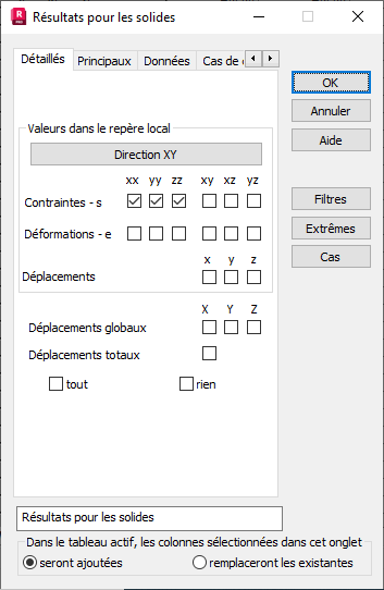 Sélectionnez l'onglet Détaillés (solides), dans la boîte de dialogue Colonnes, pour choisir les grandeurs de contraintes, de déformations et de déplacements pour la présentation.