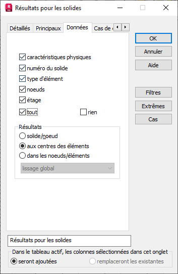 Les résultats sont affichés en forme des valeurs des éléments (accessible uniquement pour l'ordre : solide/nœud). La prise de la moyenne (lissage) est effectuée par la sélection d'une des options de la liste disponible dans la partie inférieure de la boîte de dialogue :