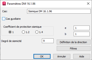 Les paramètres de l’analyse sismique des structures dépendent de la norme parasismique sélectionnée pour le calcul des structures sollicitées par des charges sismiques. Sélectionnez la norme sismique italienne DM 16.1.96 dans la boîte de dialogue Définition d'un nouveau cas ou cliquez sur Paramètres dans la boîte de dialogue Type d'analyse.