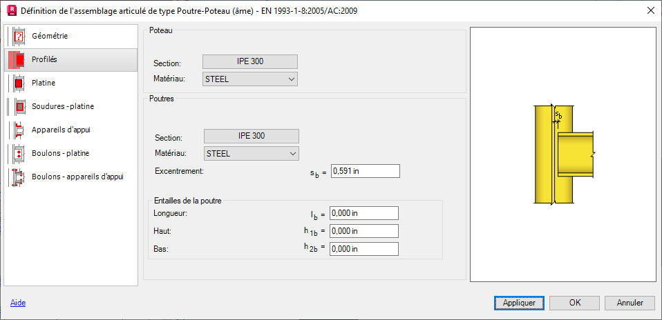 Sur l'onglet Profilés, vous pouvez définir les profilés du poteau et de la poutre dans l'assemblage.