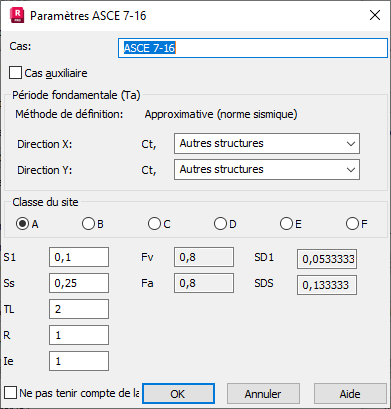 Les paramètres de l'analyse sismique simplifiée d'après la méthode de force latérale équivalente dépendent d'une norme sismique et d'une méthode de définition des valeurs des périodes fondamentales sélectionnées dans la boîte de dialogue Analyse sismique.