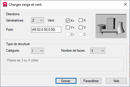 Après la définition des paramètres de base de la structure et un clic sur le bouton Paramètres, le logiciel ouvre la boîte de dialogue Vent sur construction à base polygonal.