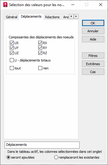 Sélectionnez l'onglet Déplacements dans la boîte de dialogue Sélection des valeurs pour les nœuds afin de modifier les composantes des déplacements de nœuds qui seront présentées.