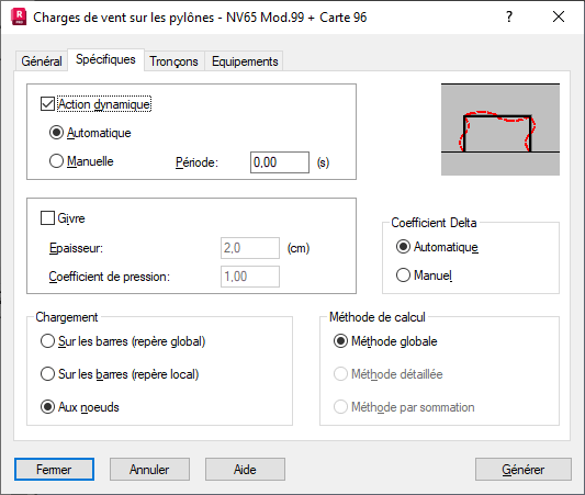 - Action dynamique [vent] : cette option permet d’activer ou de désactiver les effets dynamiques lors de la génération des charges. De plus, le logiciel peut prendre en compte automatiquement les effets dynamiques pour la période donnée des vibrations propres de la structure.
