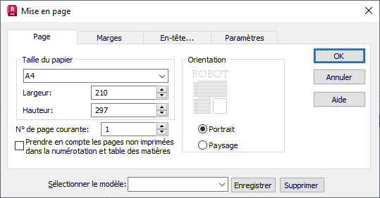 L’onglet Page permet de définir les paramètres suivants : taille du papier, orientation et le n° de page courante pour la page active.