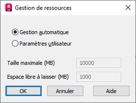 Les options disponibles dans la boîte de dialogue ci-dessus permettent de déterminer l’espace maximal sur le disque dur pour l’enregistrement des mémoires tampons avec les résultats. Par défaut, la gestion automatique est choisie (dans ce cas, tous les champs d’édition ne sont pas disponibles).