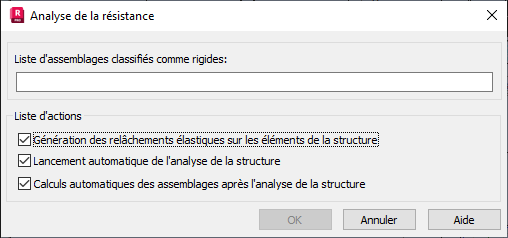 Après l’ouverture de la boîte de dialogue Analyse de la rigidité, le champ d’édition Liste d’assemblages classifiés comme rigides affiche le groupe des assemblages auxquels, pendant les calculs, le type d’assemblage semi-rigide a été affecté.