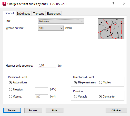 Les boutons standard (Fermer, Aide et Annuler), ainsi que le bouton Générer sont situés dans la partie inférieure de la boîte de dialogue. Cliquez sur ce boutonpour générer une charge de vent sur un poteau ainsi qu'une note de calcul.