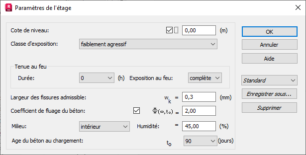 La boîte de dialogue Paramètres de l'étage permet de définir les paramètres caractéristiques d'un étage conformément à la norme britannique (BS 8110).