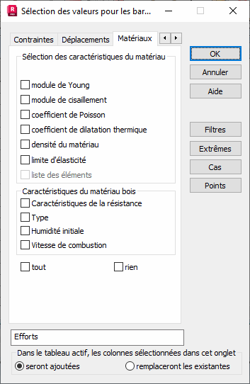 - Liste de barres : toutes les barres auxquelles ont été attribués des matériaux sont affichées dans un tableau.