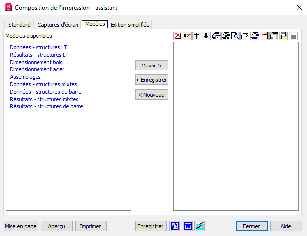 La boîte de dialogue est divisée en deux panneaux (gauche et droit). Le volet gauche présente les gabarits d’impression. Les gabarits en question contiennent une séquence définie de vues/dessins de la structure et de tableaux de données/résultats. Pour certains gabarits, la sélection des barres/nœuds a été activée. Les modèles prédéfinis sont affichés en bleu dans le panneau en question. Les modèles prédéfinis ne peuvent pas être supprimés, cependant vous pouvez les remplacer. Si vous créez un gabarit portant le nom du gabarit prédéfini (le nom du gabarit sera alors affiché en noir comme tous les autres gabarits utilisateur) et que vous le supprimez ensuite, le nom ne sera pas supprimé, l’affichage en bleu sera rétabli de même que le contenu standard du gabarit.