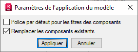 Cliquez sur Ouvrir pour ouvrir un gabarit. Un clic sur ce bouton permet de charger un fichier quelconque dans l’impression composée. Il est possible de charger les fichiers au format *.rtf. Lors de l’ouverture du modèle (après un clic sur le bouton Ouvrir), le logiciel affiche la boîte de dialogue représentée sur la figure ci-dessous. Si l’option Police par défaut pour les titres des composants est inactive (paramètre par défaut), les polices pour les titres des composants de l’impression spécifiques seront conformes aux paramètres définis dans le modèle chargé. Si cette option est inactive, la police sélectionnée dans la boîte de dialogue Préférences sera prise pour les titres. Si l’option Remplacer les composants existants est activée (elle l’est par défaut), les éléments du modèle sélectionné seront inclus dans l’impression, et les éléments précédents seront supprimés.