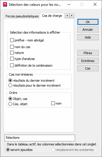 Dans le champ Sélection des informations à afficher, vous pouvez sélectionner les éléments suivants : préfixe (nom abrégé d'un cas), nom du cas, nature du cas, type d'analyse (linéaire, non linéaire, de flambement, etc.) et définition de la combinaison.