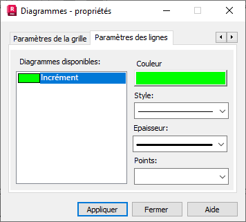 Les options contenues dans cette boîte de dialogue permettent de définir les paramètres de la ligne présentant les diagrammes définis. Le champ Diagrammes disponibles présente toutes les grandeurs sur l'axe Y. Pour chaque diagramme, les options suivantes sont disponibles :