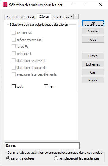 - Précontrainte SIG : colonne réservée à la valeur de contrainte normale dans le câble pour le cas de montage (calculée par rapport à la corde de l’arc constitué par le câble). Cette valeur doit être atteinte pour les charges relatives au cas de montage.