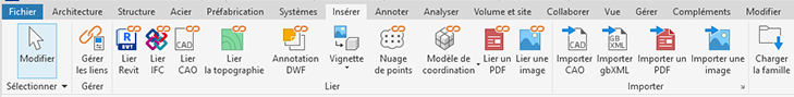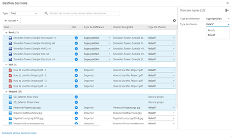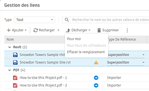 La nouvelle boîte de dialogue Gestion des liens affiche tous les formats CAO des fichiers liés et uniquement les formats de CAO DWG, DXF, DGN, SKP et AXM importés pour les projets et les familles.