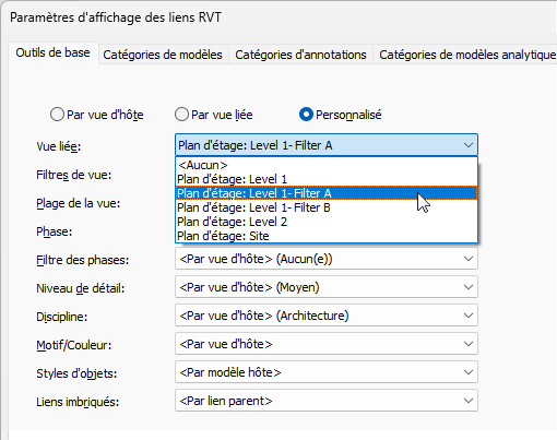 - Pour l’option Vue liée, sélectionnez la vue du modèle lié dont vous souhaitez utiliser les paramètres d’affichage pour le modèle lié de la vue d’hôte active.