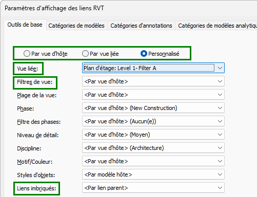 | Par vue d'hôte | Applique le filtre (et d'autres paramètres de visibilité/graphismes) pour la vue d'hôte aux éléments du modèle hôte, du modèle lié et des modèles imbriqués.