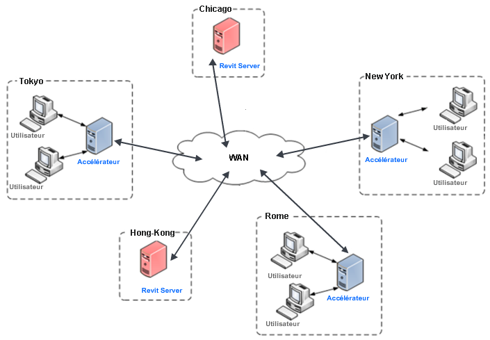 Revit Server offre le partage de projet basé sur un serveur, ce qui permet aux équipes éloignées géographiquement de collaborer sur le même modèle via un réseau étendu (WAN). Comme illustré ci-dessous, plusieurs membres d'une équipe dispersés sur plusieurs sites locaux utilisent des serveurs Revit Server Accelerator pour se connecter à un ou plusieurs serveurs Revit en réseau.