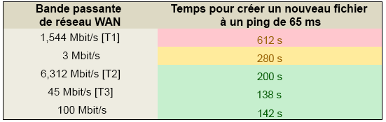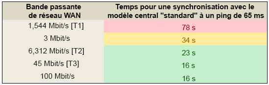 Notez que la "bande passante réseau WAN" indiquée reflète le débit réel du réseau, et non le débit de la connexion. Des facteurs externes, tels que le trafic de diffusion en continu d’une autre nature, peuvent réduire la bande passante réelle disponible. Par conséquent, il est recommandé de valider le comportement du réseau pendant les périodes d’utilisation standard. Il suffit de mesurer le temps nécessaire pour copier plusieurs centaines de méga-octets de données à partir d’un point du réseau sur un autre. (Assurez-vous que la compression réseau et la mise en forme de paquets n’ont pas d’incidence sur les performances de l’opération.)