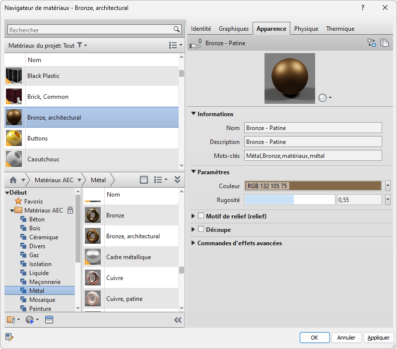 La figure suivante présente certaines propriétés d'apparence d'un matériau sélectionné, telles qu'affichées dans le navigateur de matériaux.