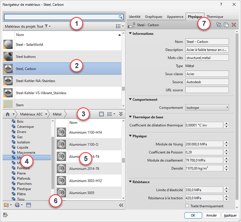 | 5 | Liste des matériaux de la bibliothèque : affiche les matériaux de la bibliothèque ou de la catégorie (classe) sélectionnée dans la liste de bibliothèques. |
