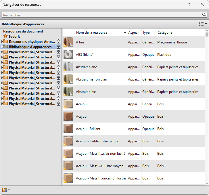 Les ressources sont enregistrées dans un projet Revit ou dans une bibliothèque. Les ressources qui se trouvent dans un projet Revit mais qui ne sont référencées par aucun matériau sont enregistrées dans la bibliothèque des ressources non référencées. Vous pouvez créer et modifier des ressources non référencées lors d'une session Revit en fonction de vos besoins. Toutefois, vous devez enregistrer votre projet Revit pour enregistrer les ressources non référencées créées ou modifiées durant la session.