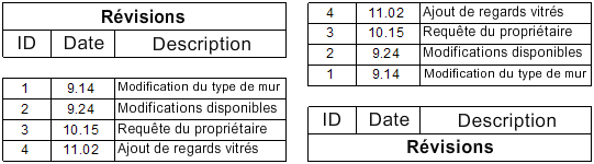Les nomenclatures de révision peuvent afficher les informations de plusieurs façons. Certaines sociétés de conception optent pour une approche descendante. En d'autres termes, les en-têtes de colonne et les premières lignes de révision se trouvent dans la partie supérieure de la nomenclature. D'autres adoptent une approche ascendante avec les en-têtes de colonne et les premières lignes de révision en bas de la nomenclature. Dans les deux cas de figure, la nomenclature de révision trie les lignes à l'aide des paramètres définis sous l'onglet Tri/Regroupement de la boîte de dialogue Propriétés des révisions.