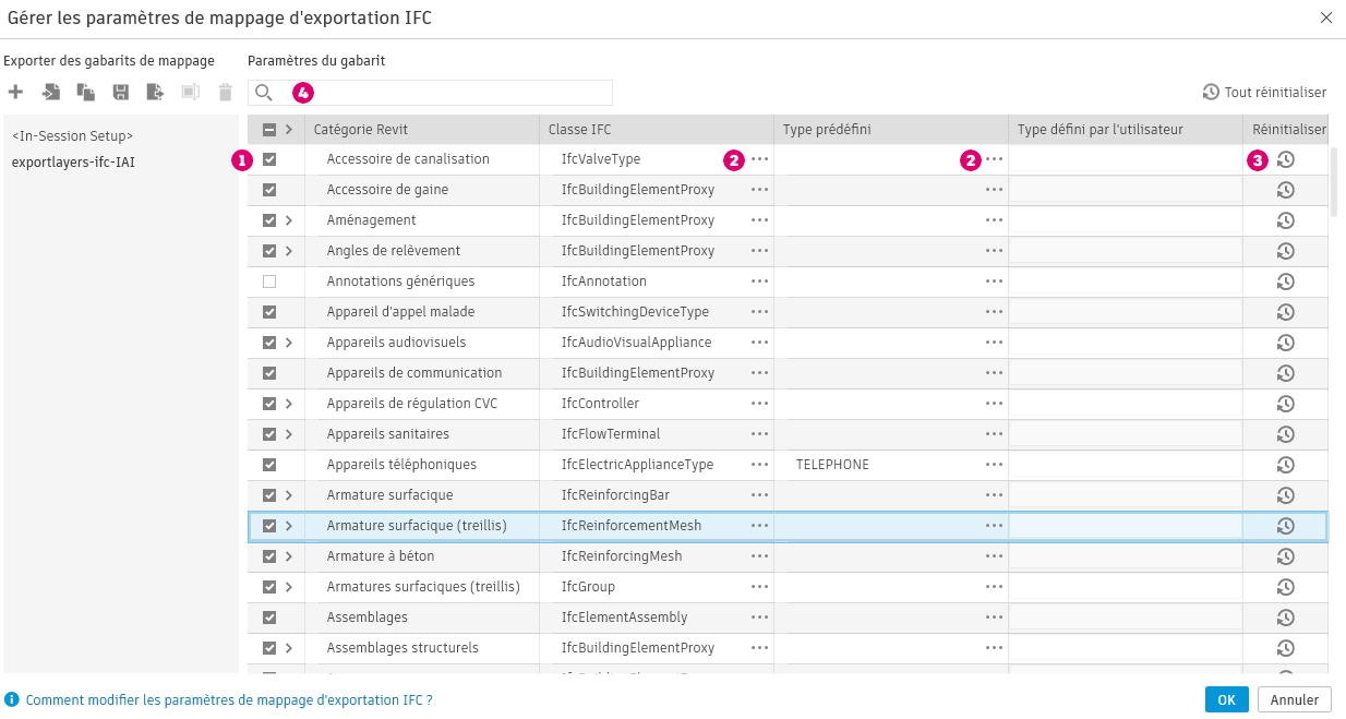 : utilisez la commande de réinitialisation pour rétablir les valeurs par défaut de la classe IFC et du type prédéfini. Utilisez la commande située dans la partie supérieure de la colonne pour rétablir toutes les valeurs par défaut.