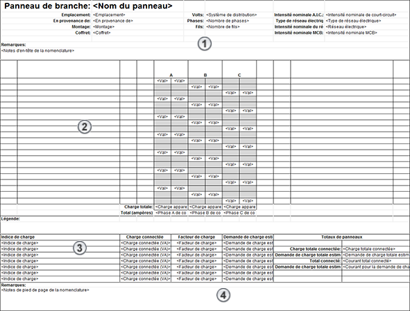 Pour les systèmes électriques, les nomenclatures de tableaux affichent des informations sur le tableau, les circuits reliés au tableau et les charges correspondantes.