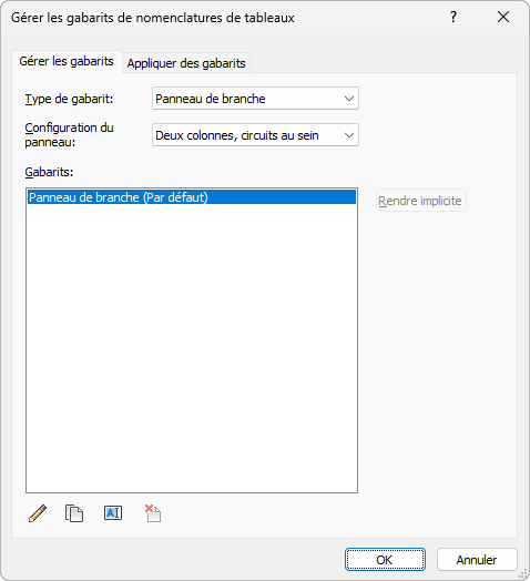 Vous pouvez utiliser la boîte de dialogue Gérer les gabarits de nomenclatures de tableaux pour modifier, dupliquer, supprimer et appliquer des gabarits de nomenclatures de tableaux. Vous pouvez également spécifier le gabarit par défaut.