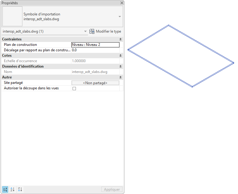 Les propriétés suivantes d’une dalle AutoCAD Architecture sont conservées lors de son importation dans Revit :