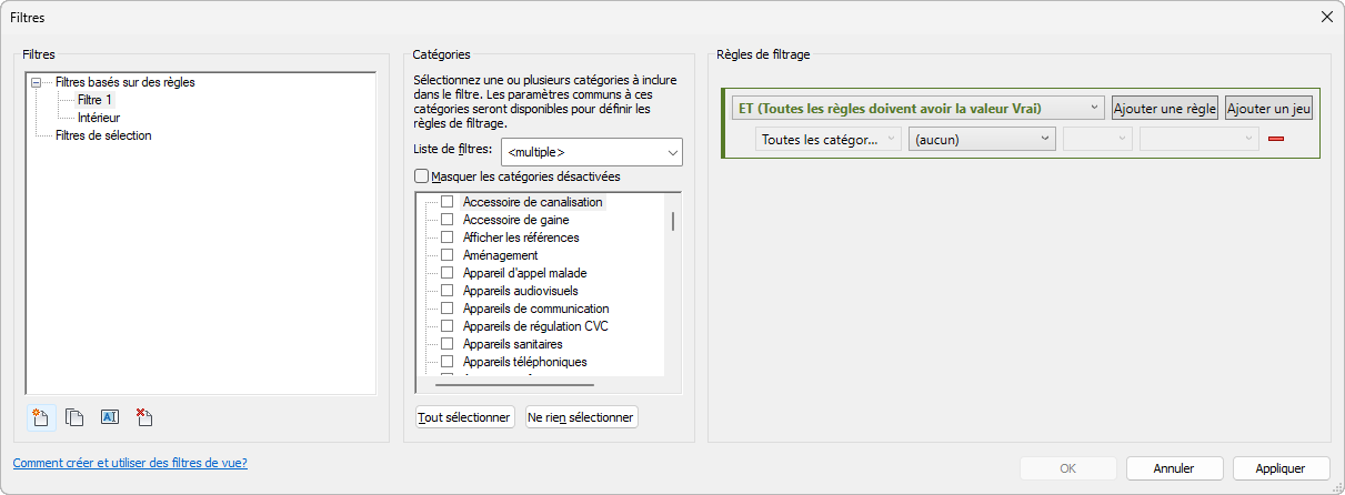 Créez un filtre de vue permettant d'identifier les éléments en fonction de catégories et de valeurs de paramètres.