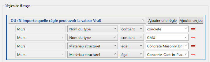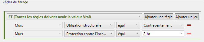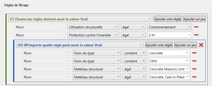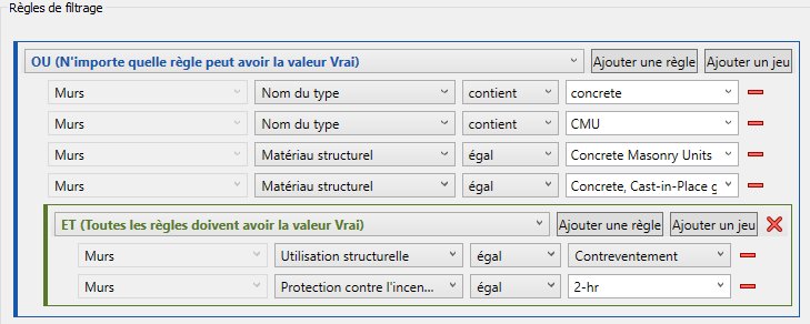 Dans ce cas, pour identifier tous les murs de contreventement du modèle construits en béton et présentant une résistance au feu de deux heures, vous devez commencer par le jeu de règles ET, puis imbriquer un jeu de règles OU dans celui-ci, comme indiqué ci-dessous :