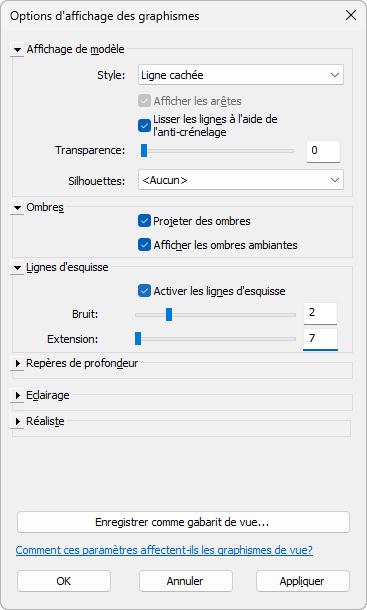 Cette vue utilise les paramètres suivants dans la boîte de dialogue Options d'affichage des graphismes :