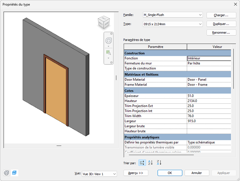 Dans l’exemple ci-dessous, la boîte de dialogue Propriétés du type s’affiche pour un type de porte, avec le volet d’aperçu ouvert.
