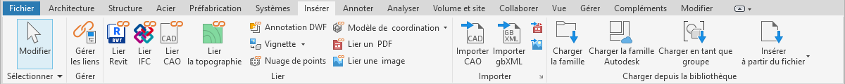 Le ruban s'affiche dès que vous créez ou ouvrez un fichier. Il contient tous les outils nécessaires à la création d'un projet ou d'une famille.
