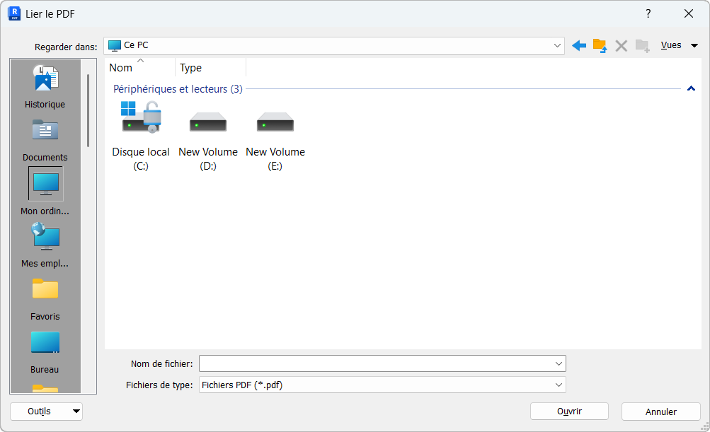 Vous pouvez accéder aux outils Lier le PDF et Lier l’image sous l’onglet Insérer de la barre d’outils Revit. Après avoir cliqué sur le bouton Lier le PDF ou Lier l’image, une boîte de dialogue s’affiche et vous propose de sélectionner l’image ou le fichier PDF de votre choix.