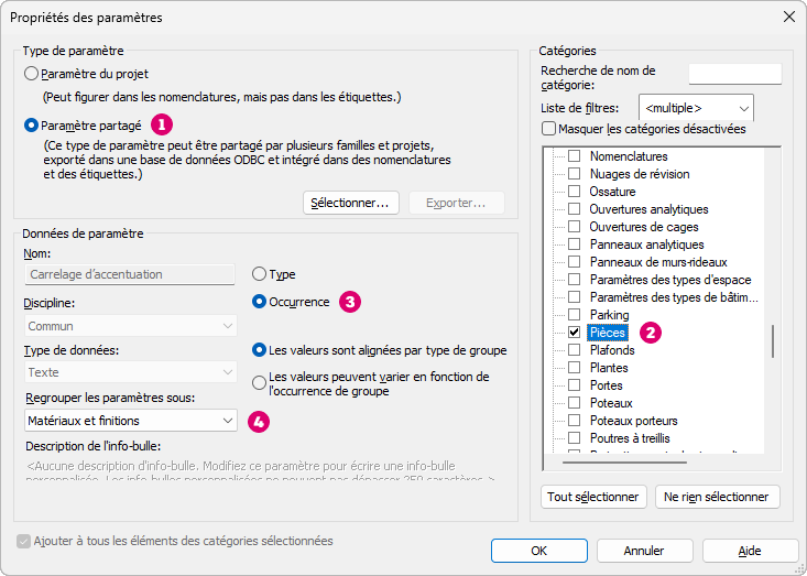 Les paramètres partagés doivent à présent être ajoutés au projet et affectés à la catégorie Pièces. Ainsi, le paramètre apparaît sur les éléments de pièce de votre modèle, ce qui vous permet d’affecter des paramètres aux paramètres.