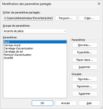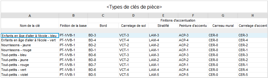 Une fois les paramètres disponibles dans le projet, vous pouvez les ajouter en tant que paramètres de projet comme nous l’avons fait précédemment, ou les ajouter directement à une famille qui est chargée dans le projet. Vous pouvez désormais créer la nomenclature de clés. Pour ce faire, vous devez sélectionner les paramètres que vous souhaitez contrôler ou affecter via le type de clé. Pour notre exemple, nous allons créer des types de clés pour chaque ensemble de finition de pièce. Tous les paramètres partagés « Accents de pièce » seront ajoutés à la nomenclature de clés. Nous allons également ajouter le paramètre intégré de finition de la base. Dans ce cas, nous l’utilisons pour la finition de la pièce avant l’ajout des accents.