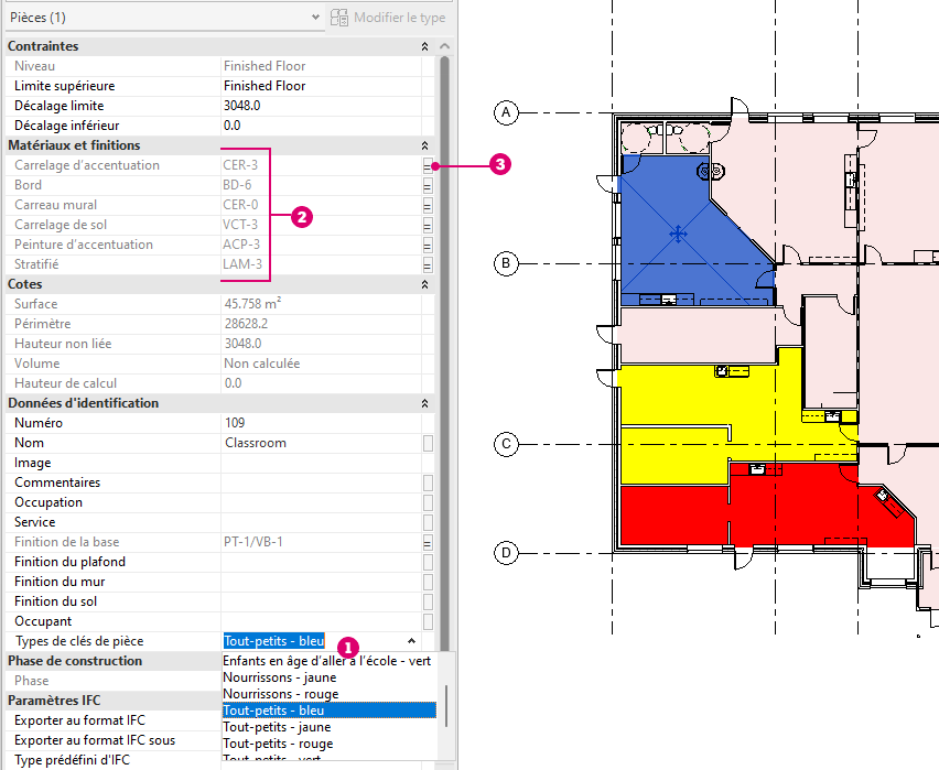 La dernière étape consiste à appliquer des types de clés aux pièces. Sélectionnez un ou plusieurs éléments de pièce dans le modèle et, dans la palette Propriétés, utilisez le menu déroulant situé sous la section Identité de la palette Propriétés