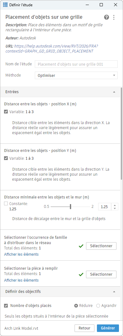 Pour trouver la disposition optimale pour la salle à manger principale et les deux espaces extérieurs, utilisez la Conception générative dans Revit. L’étude Placement d’objets en grille étagée peut aider à maximiser le nombre de tables tout en maximisant l’espace entre les clients assis.