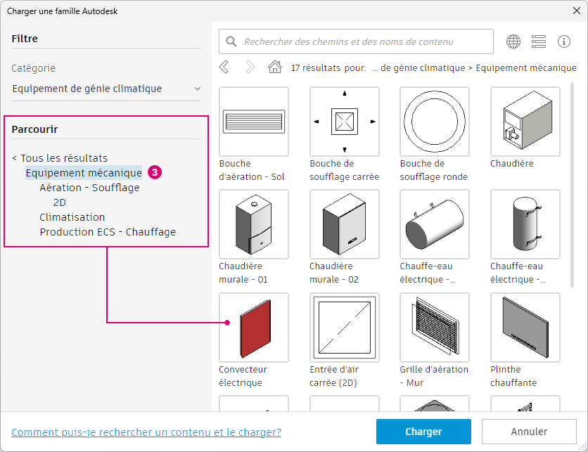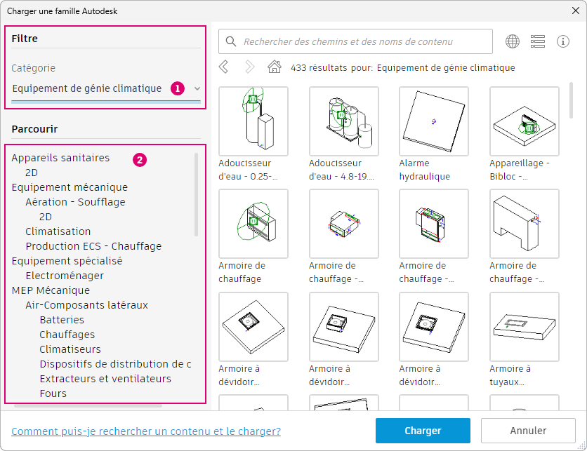 . Seuls les éléments de cette catégorie sont affichés dans la fenêtre des éléments. Par exemple, vous pouvez sélectionner la catégorie « Équipement de génie climatique ». Dans la catégorie Équipement de génie climatique, de nombreux éléments sont triés en plusieurs groupes : Protection contre les incendies, Génie climatique et Plomberie